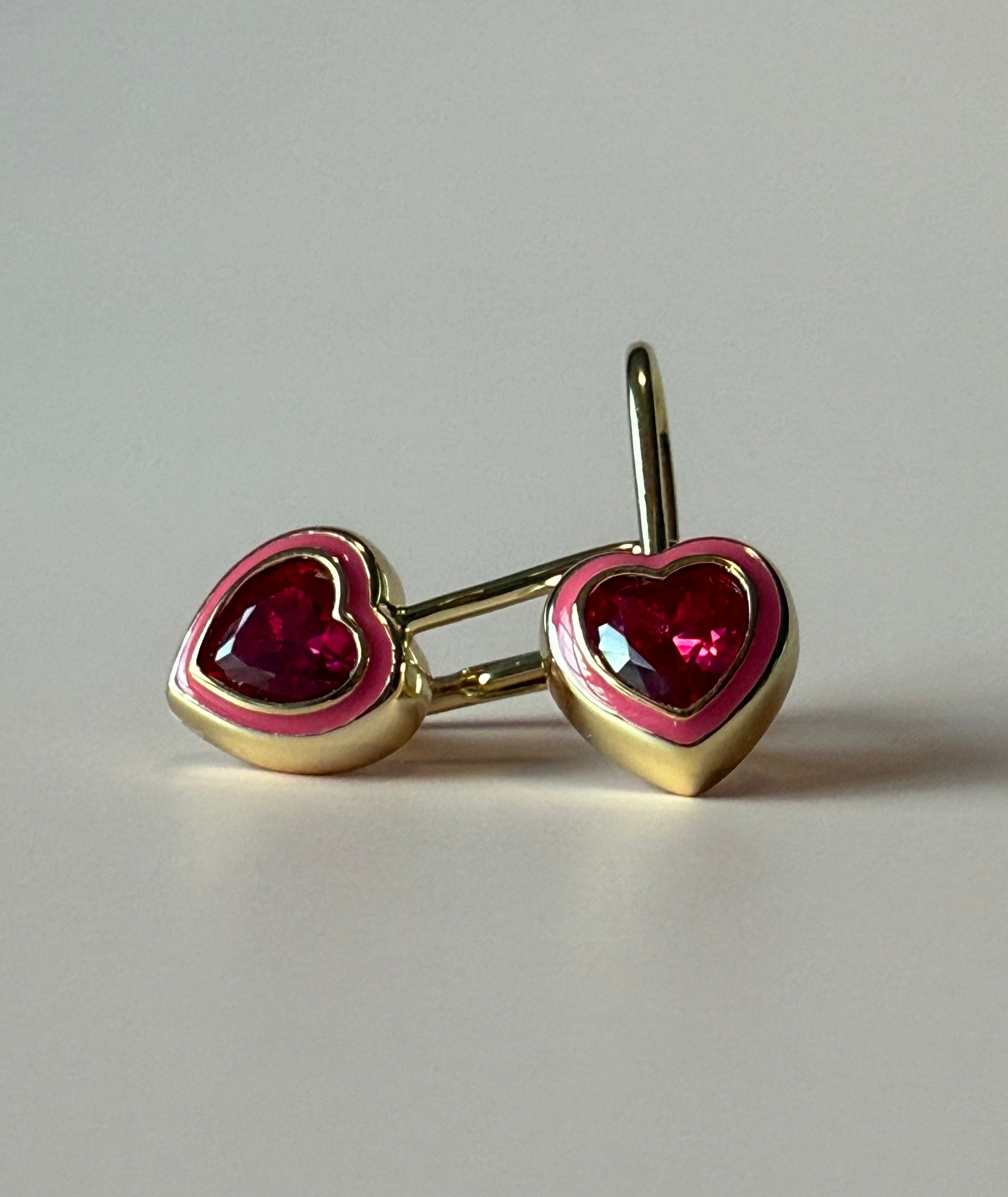 5mm pink ruby heart, 18mm drop, leverback earrings