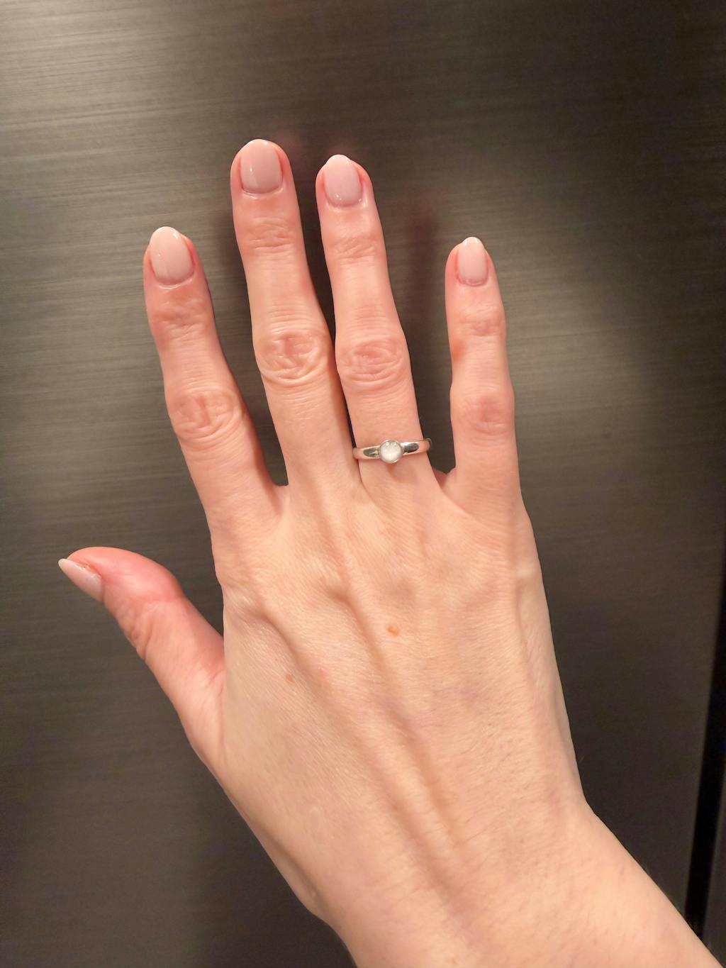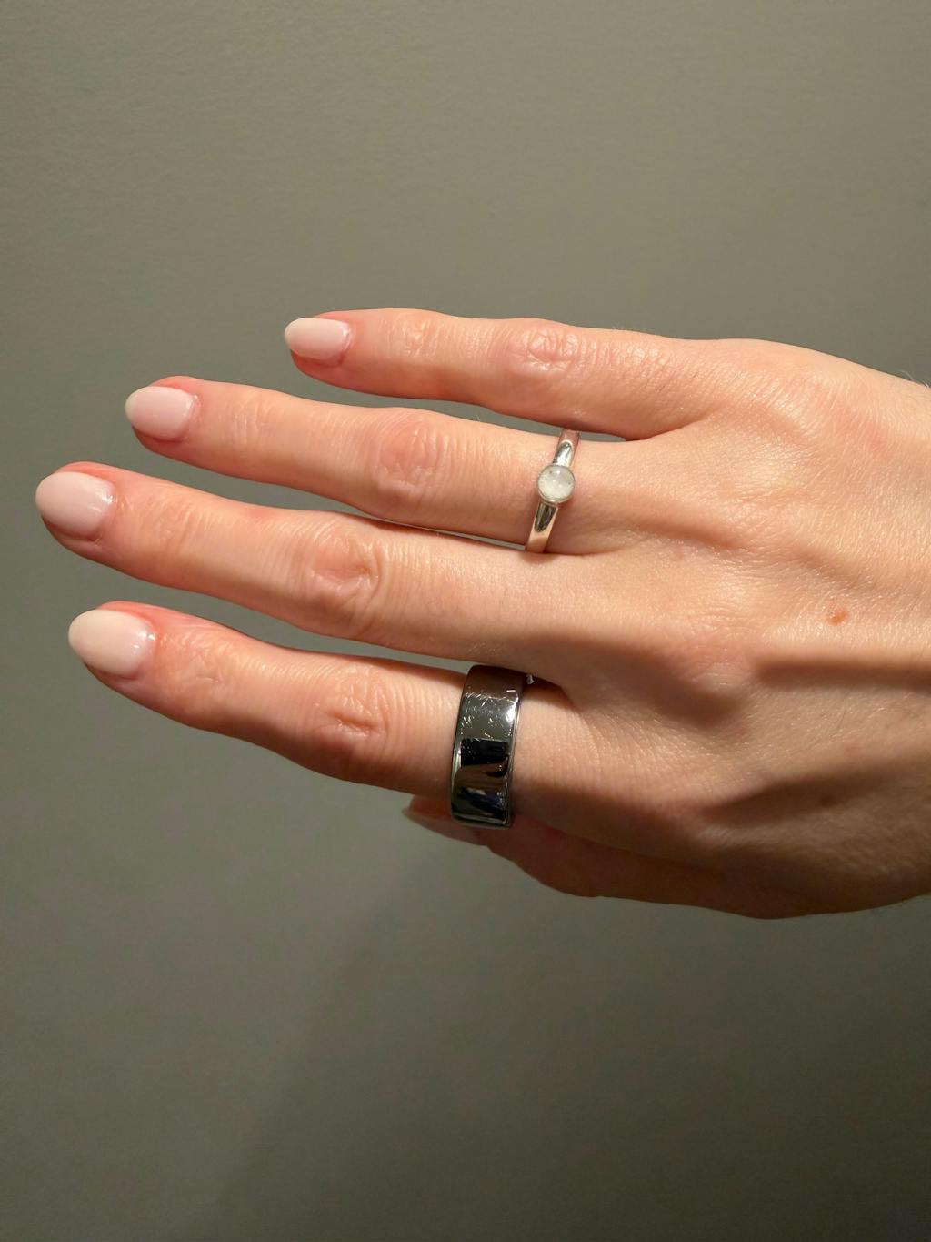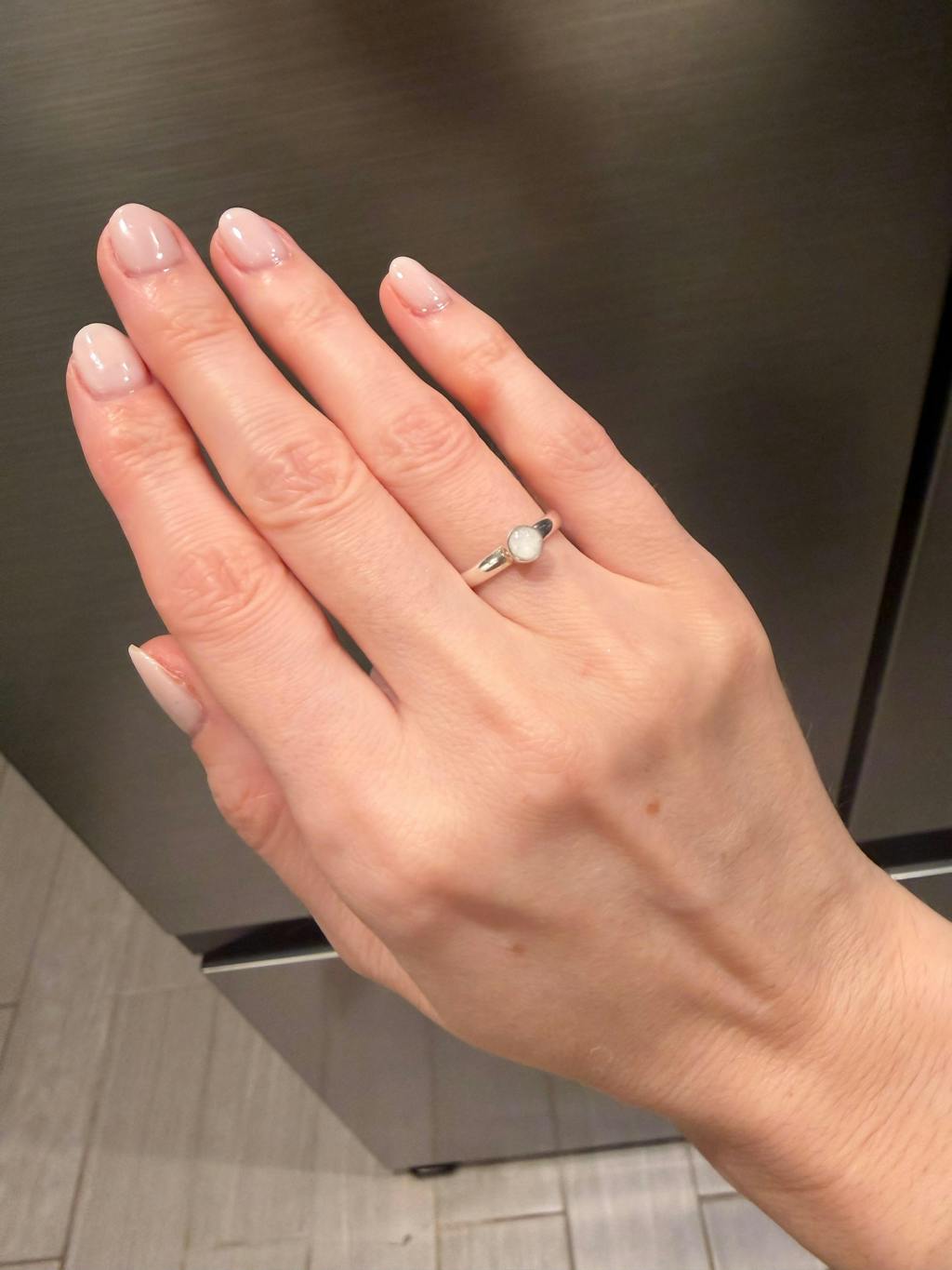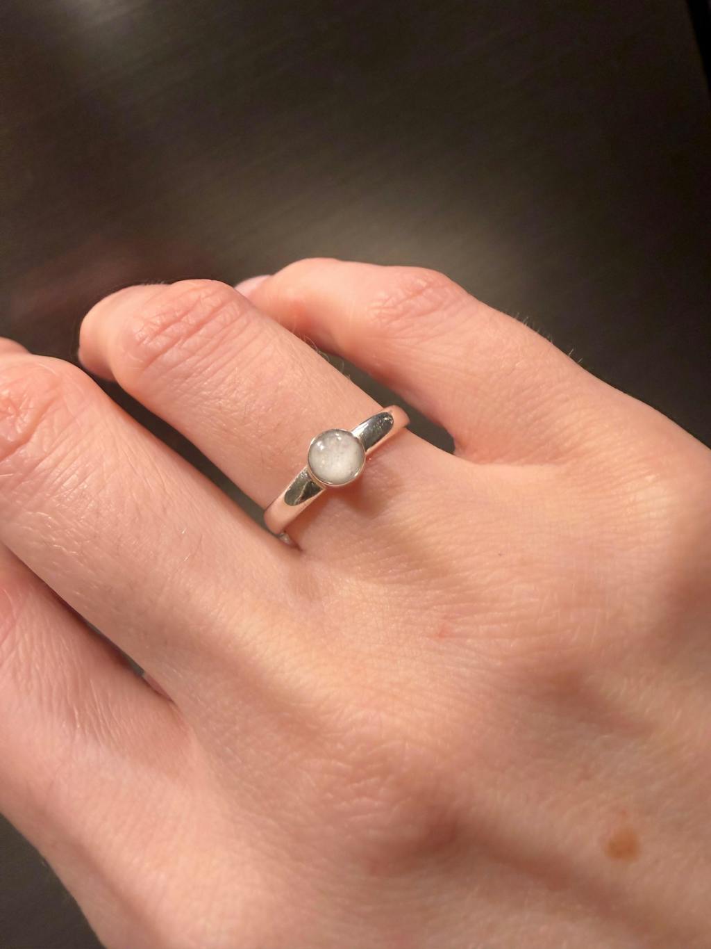 This ring is beautiful! Dainty, very shiny, and most importantly, contains my baby’s ashes. Tiffany was an absolute pleasure to work with. I had many questions and she went back and forth with me and was incredibly kind and helpful. I included a photo with the oura ring, which is a large ring, on as well for a size reference.